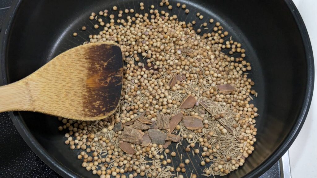 ①コリアンダー、クミン、シナモンをフライパンで弱中火で乾煎りします。香りが出てきて、うっすら煙が出てきたら火を止めます。