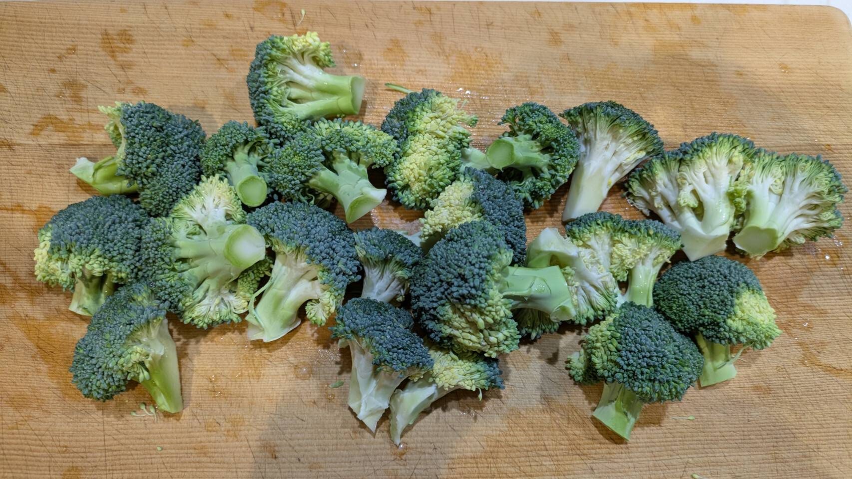 ブロッコリーは小房に分けます。水気が残っていると油がはねたり、仕上がりが水っぽくなったりするため、洗った後はキッチンペーパーでしっかり水分を拭き取ってください。