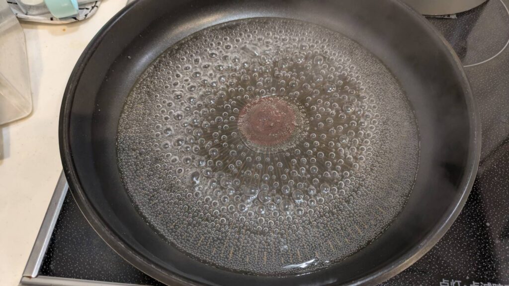 2.フライパンに浅く水を張り(フライパンの底一面に浸るくらい)塩を入れ、沸騰させる。