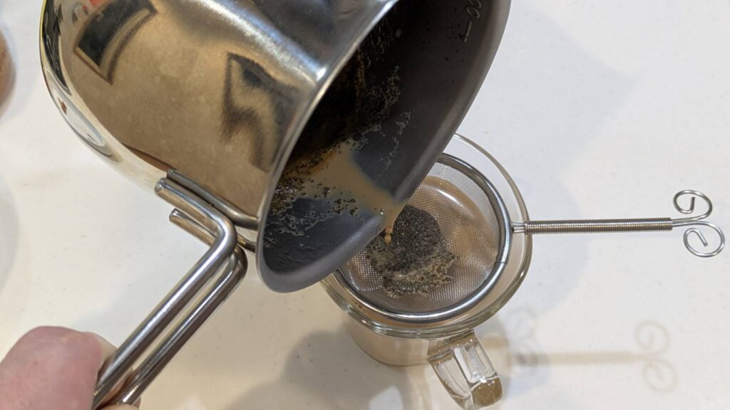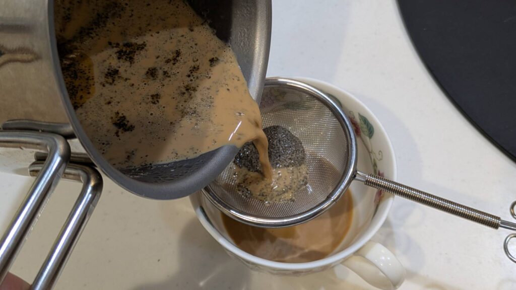 こし器で茶葉とスパイスを濾しながら、カップに注いで完成です!