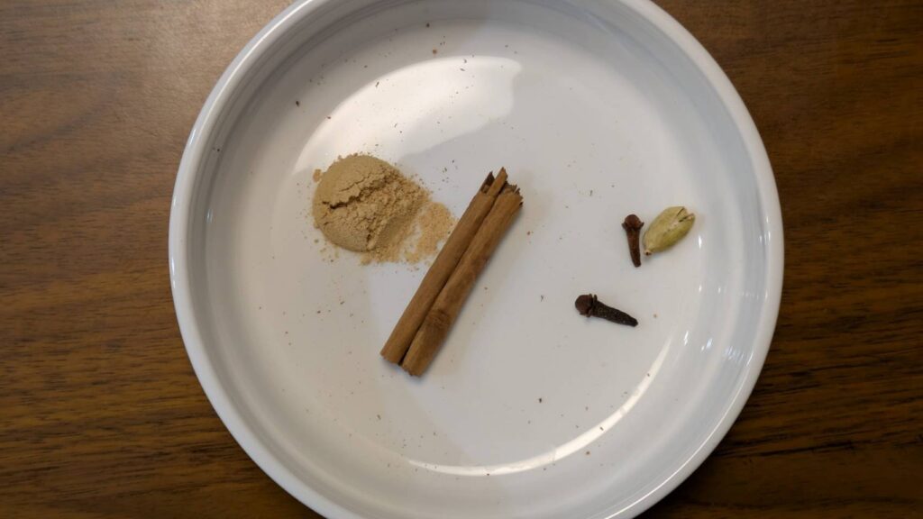 カルダモン、クローブ、シナモンスティック、ジンジャーパウダー