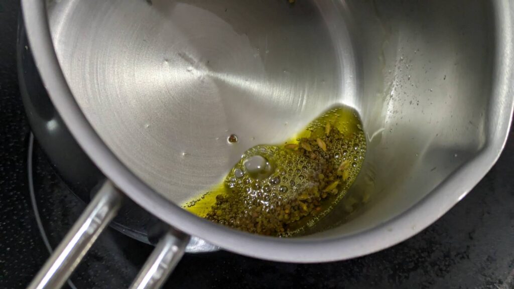 ③フライパンにマスタードオイルを入れ、弱中火にかけ、温まったらホールスパイスaをいれる。パチパチ弾けてきたら火をとめ、②と混ぜ合わせる。