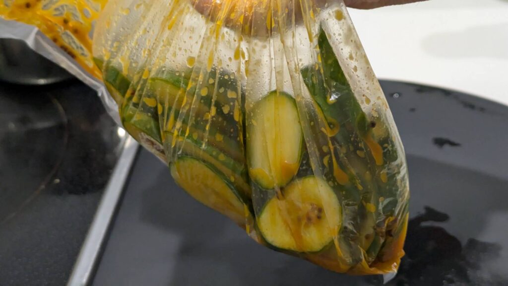 ④冷めてから、①で切ったきゅうりを袋などに入れ、手で揉み込む。