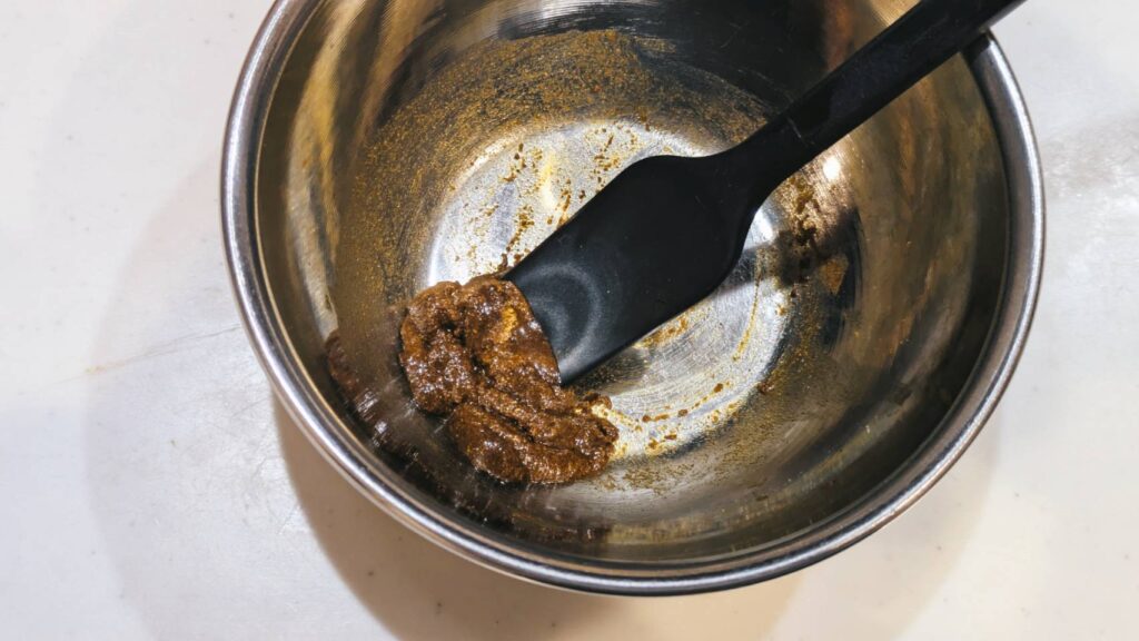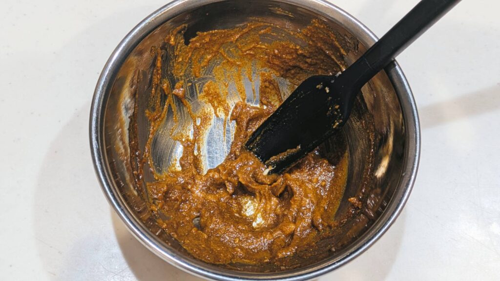 ①ボールにカレー粉、植物油を入れペースト状になるまで混ぜる。
