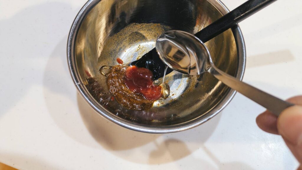 ②ペースト状になったらトマトケチャップ、蜂蜜、ナンプラーを入れ混ぜる。