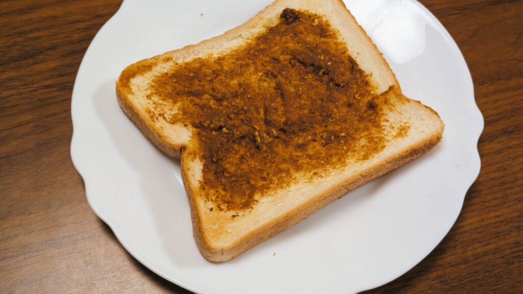④ペースト状になったらパンに塗り、トースターで1000w3分ほど焼く。カリッとなれば完成です。