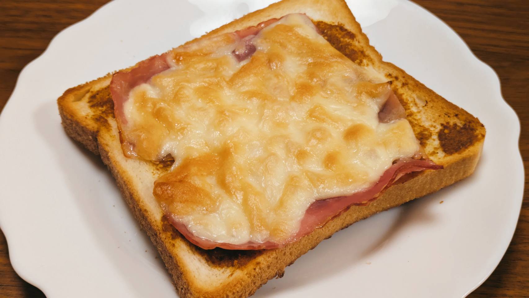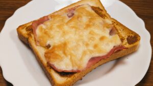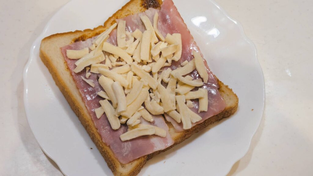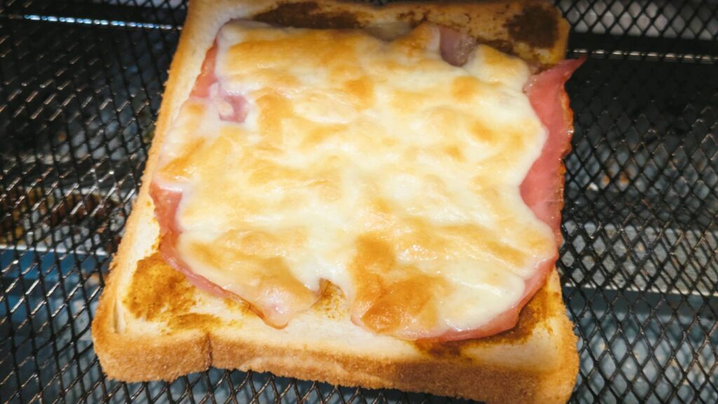 パンにペーストを塗り、その上からベーコン、チーズを乗せて、トースターで1000w6分ほど焼く。チーズに焼き色が付けば完成です!