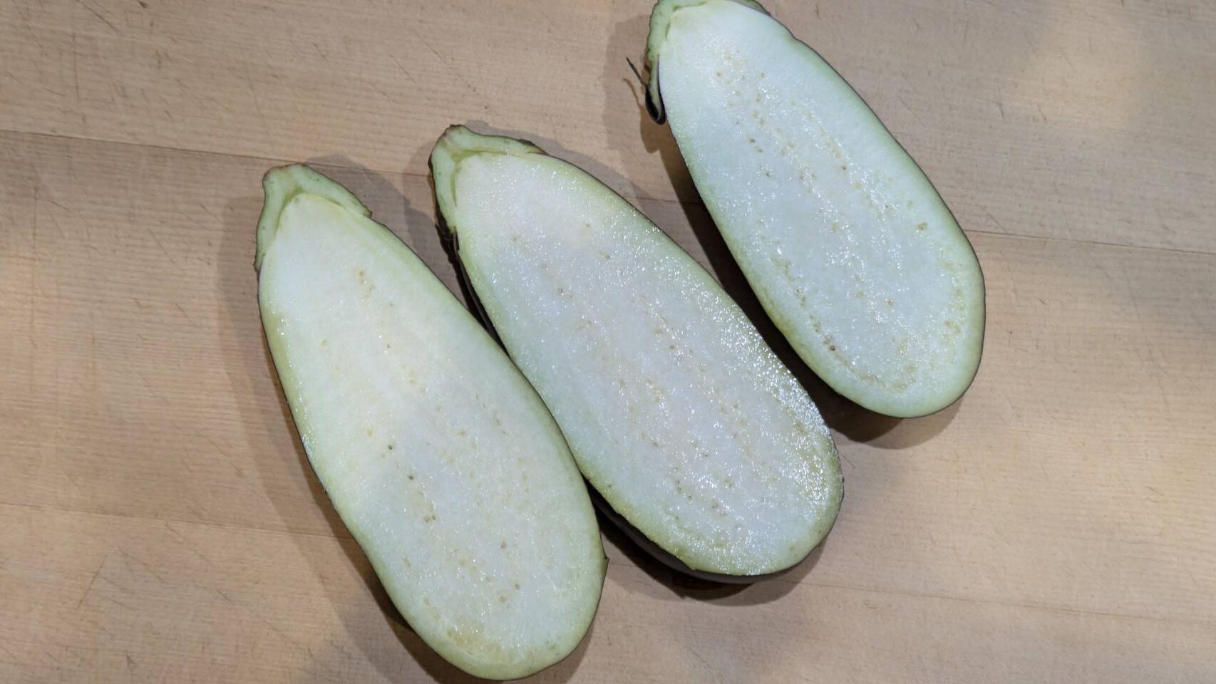 ②ナスの皮を剥き、縦に3等分に切る。①をナス全体にまぶす。