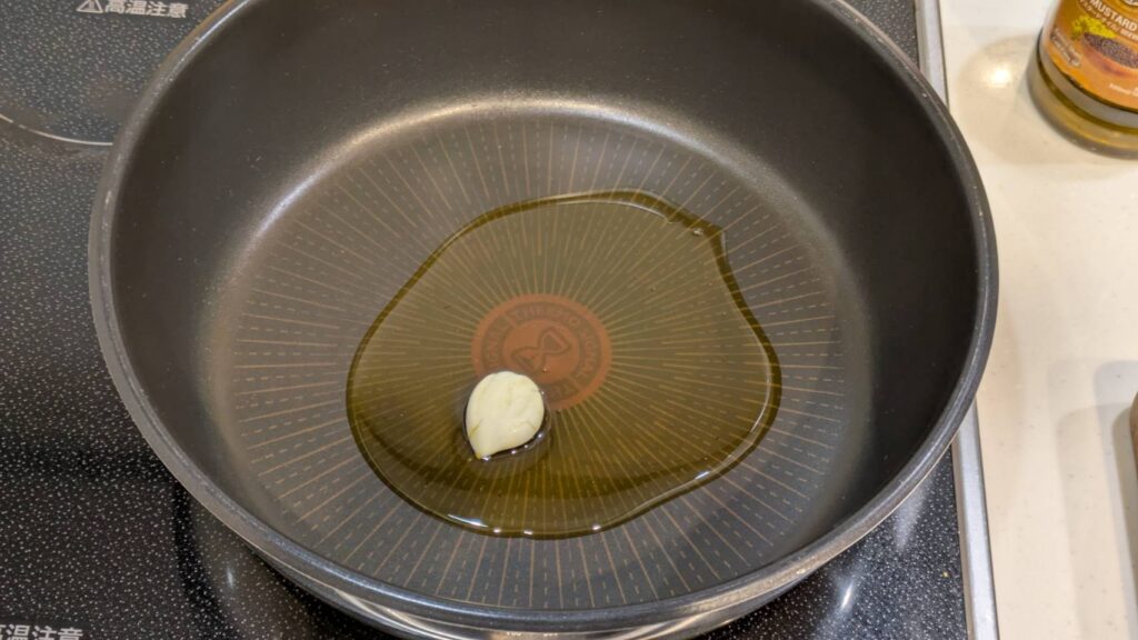 ③フライパンにマスタードオイルをひき、潰したにんにくを入れる。
