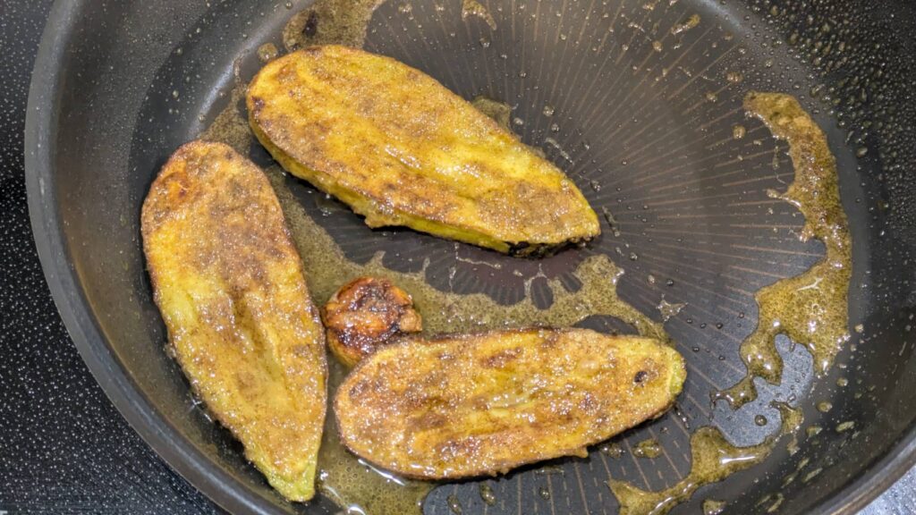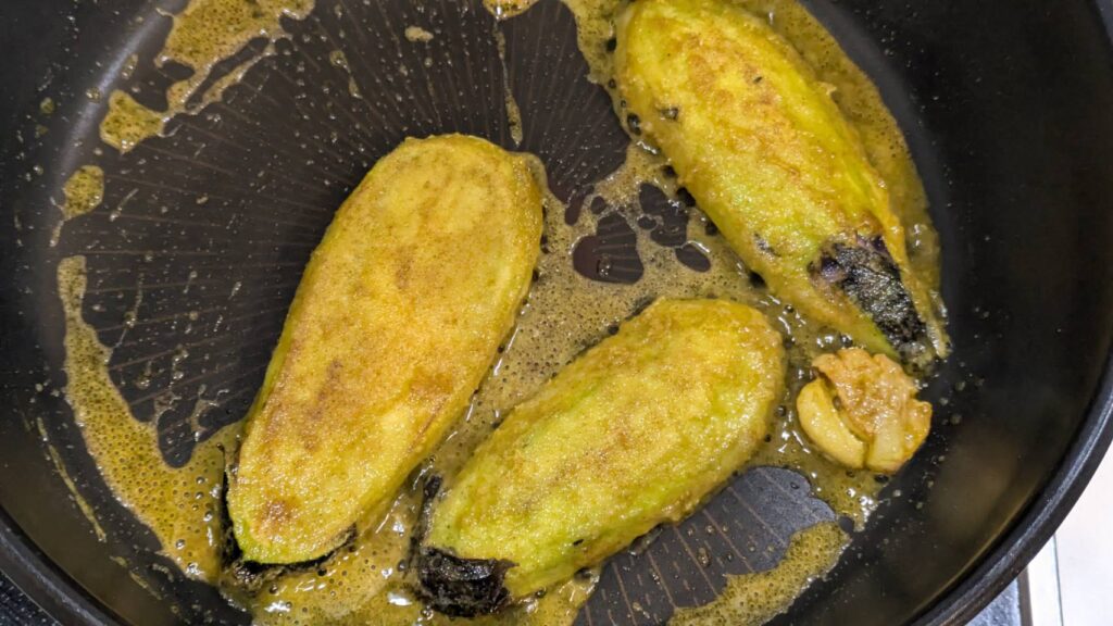 ④マスタードオイルが温まってきたら、②のナスを入れて、焼き色がついて少しカリッとなってきたら裏返す。
