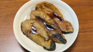 ⑤ナスの裏表焼き色が着いたら、器に盛り付けて醤油を少しかけて完成です。