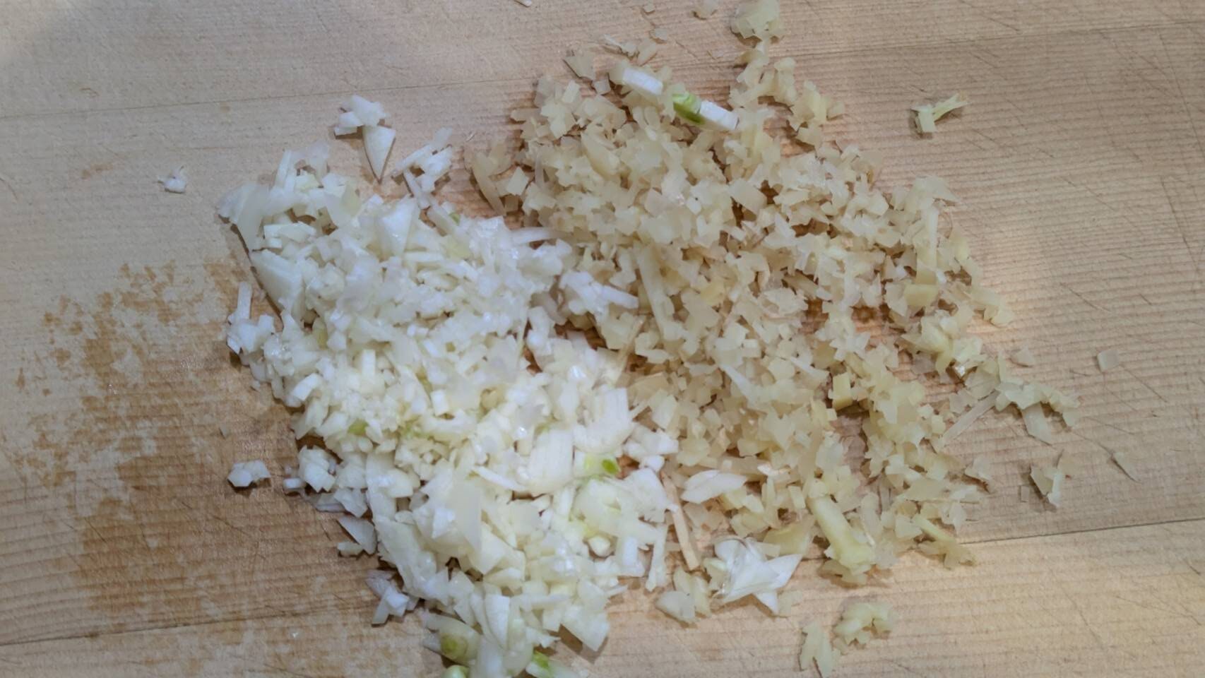 ①フライパンにサラダ油をひき中火にかけて玉ねぎ、塩を入れ炒める。しんなりして来たら、ピーマン、にんにく、しょうが、を入れ炒める。