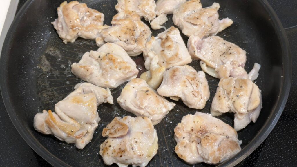 ⑤煮込んでる間に塩コショウ少(分量外)を振りかけた鶏もも肉を別のフライパンで焼く。