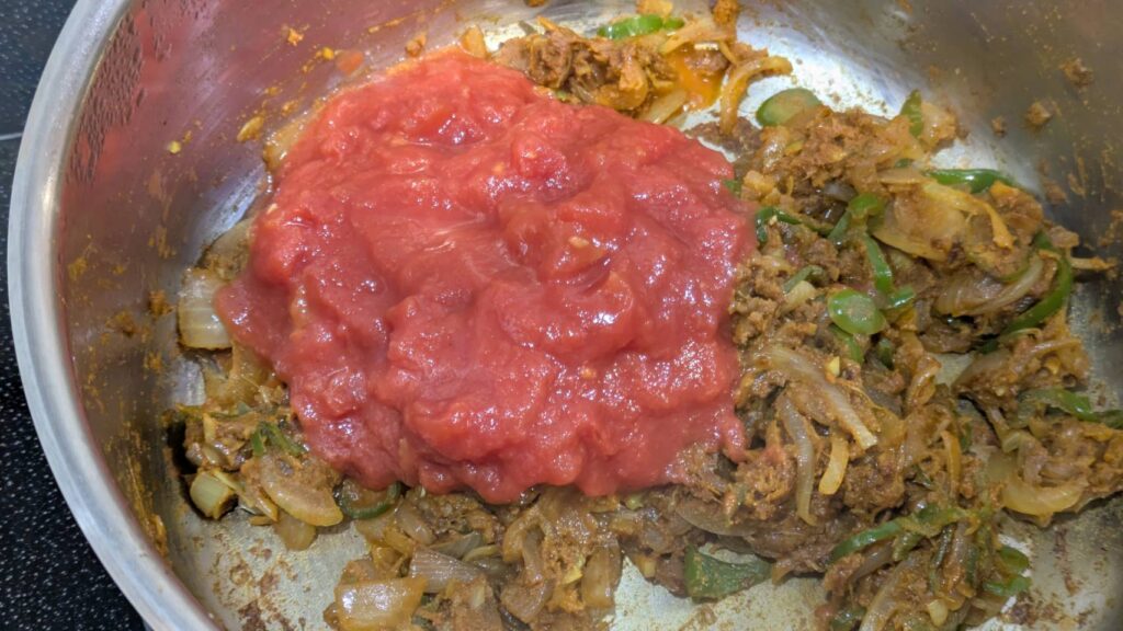 ③香りが出てきたらトマトを入れ中火にして煮立たせる。