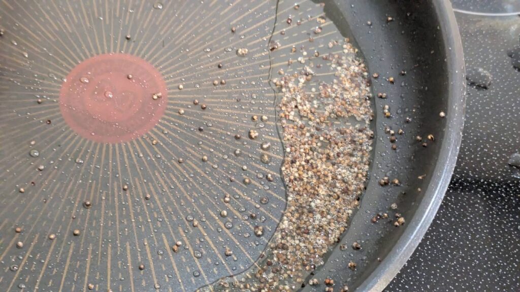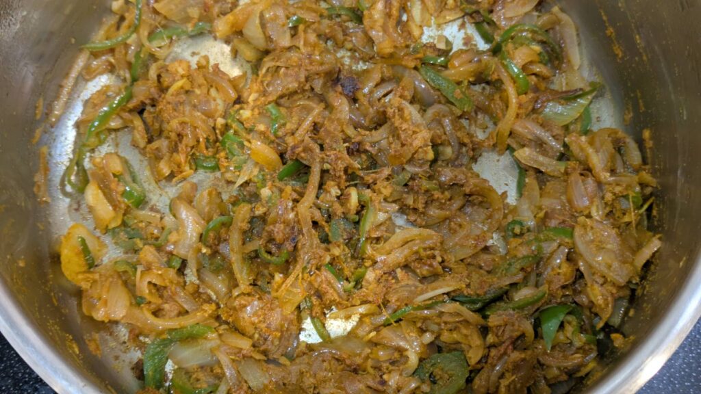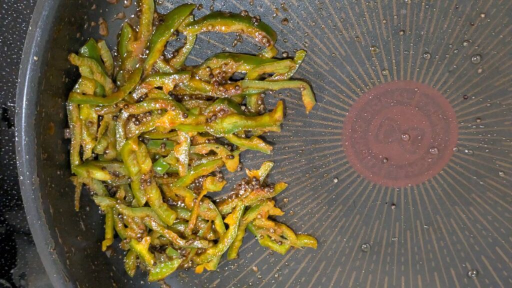 ⑦別のフライパンにテンパリング用のサラダ油、マスタードシードを入れ、中火にかける。パチパチなって来たら、フタをし火を止める。そこにピーマン、パプリカパウダー、カレーリーフを入れ火を止めた状態で軽く炒める。