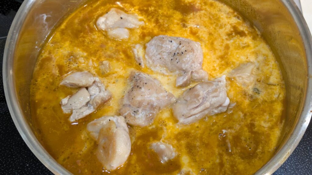 ⑥鶏もも肉が焼けたら、④に入れ、ココナッツミルク、ナンプラー、砂糖も入れ煮立たせる。煮立ったら弱火にし、フタをして20分煮込む。