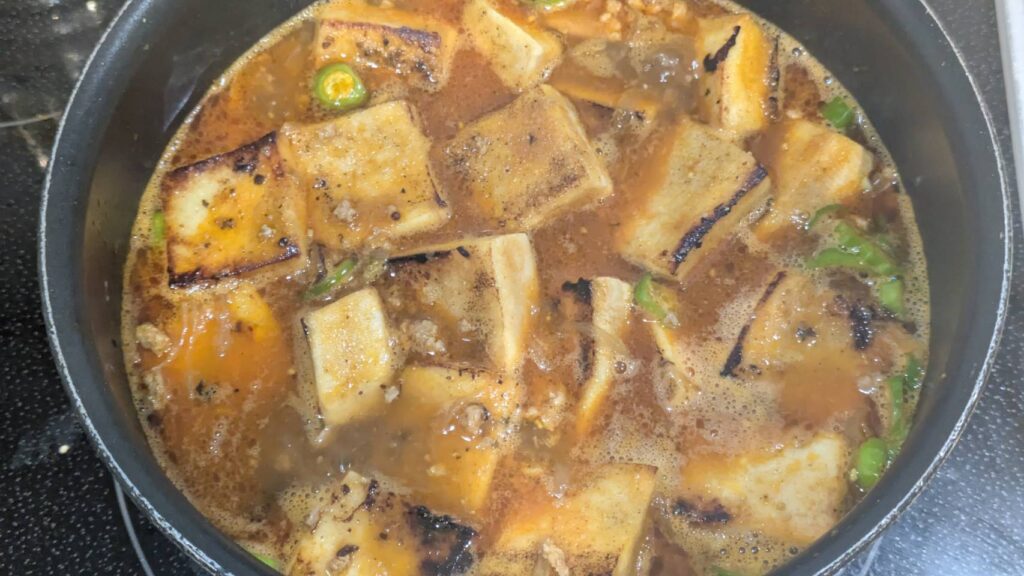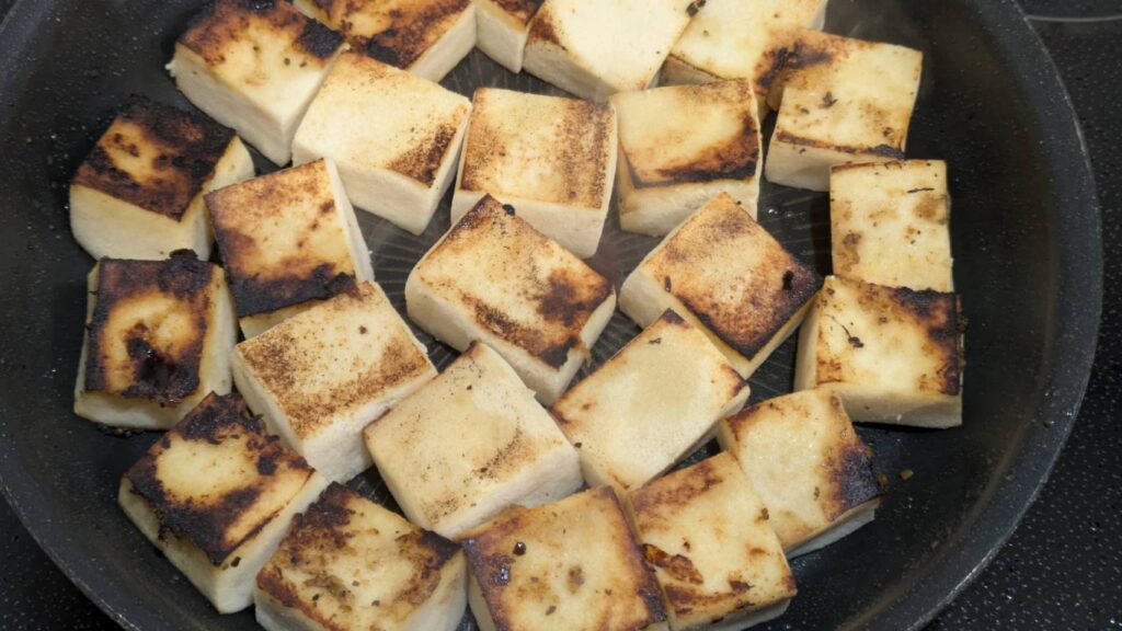 パニールの代わりに高野豆腐を使う場合、油で焼くことで高野豆腐の細かいスポンジ構造に油分が入り込みます。