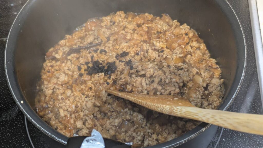 にんにく生姜の香りが出て来たら、豚ひき肉を入れ色が変わるまで炒める。色が変わったらトマトジュースを入れ煮詰める。