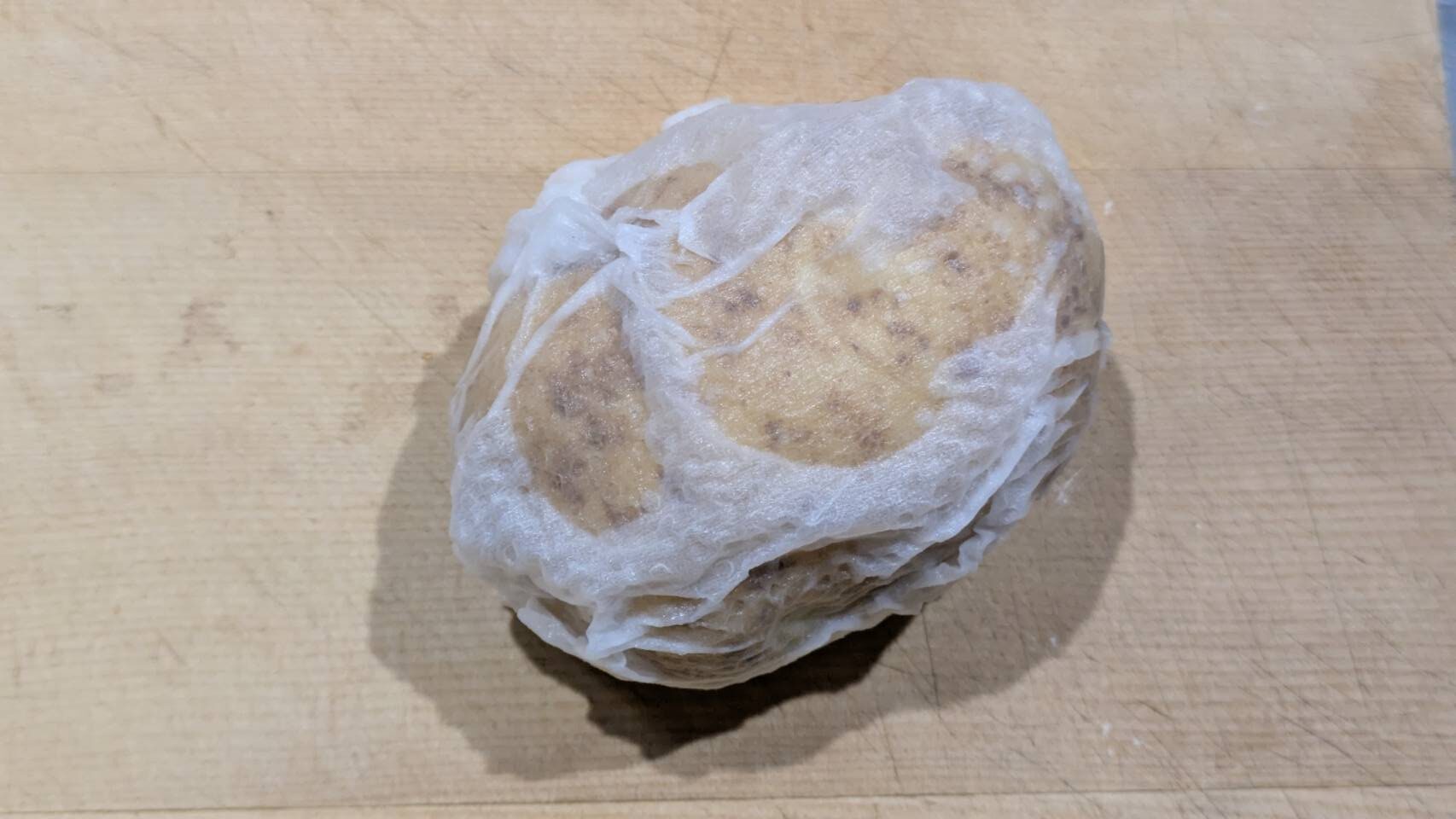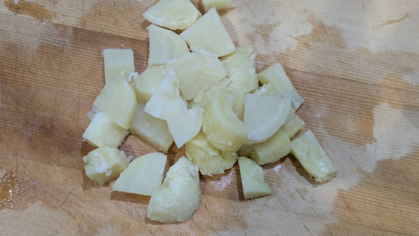 ①じゃがいもを濡らしたキッチンペーパーで包み、その上からラップで包み600wの電子レンジで4〜5分チンする。竹串や箸を刺して、すーっと入ればOK。