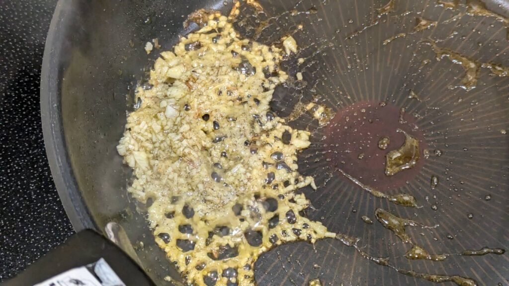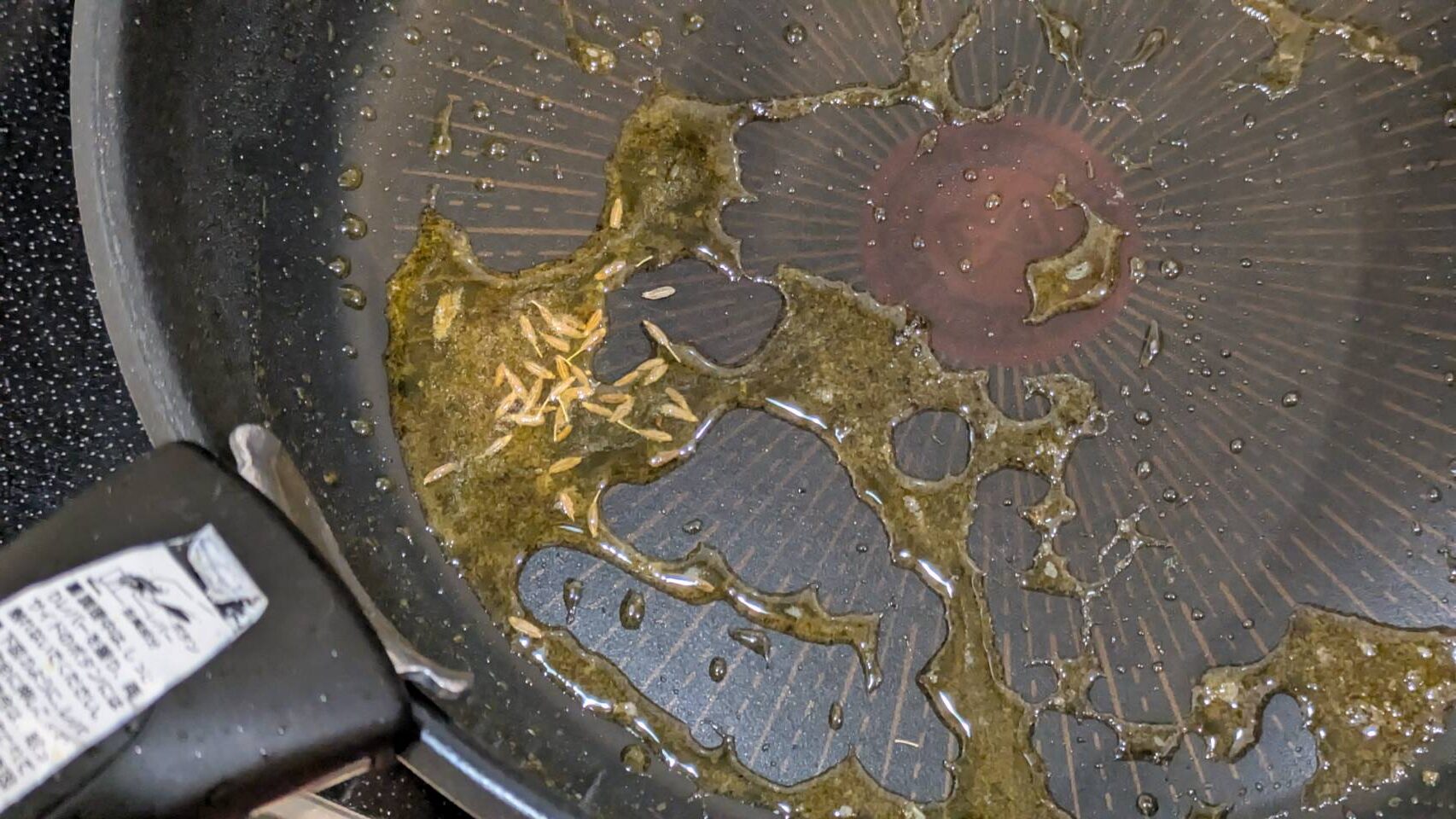 ③フライパンにマスタードオイルをひき、クミンシードとにんにくを入れ弱中火にする。