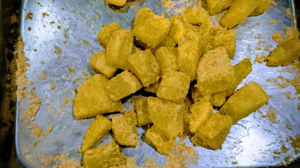 ②じゃがいもをサイコロ状に切り、カレー粉をまぶす。