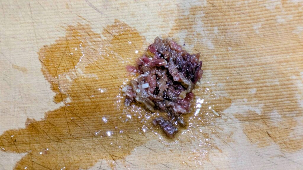 ④クミンとにんにくの香りが出てきたら、みじん切りにしたアンチョビフィレを入れる。