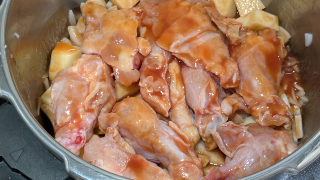 ③タイマーがなったら火を止めて圧を抜く、圧が抜けたらフタを開けて、ナンプラーを入れてフタ無し、弱中火で表面がポコポコなるくらいで5分煮込む。