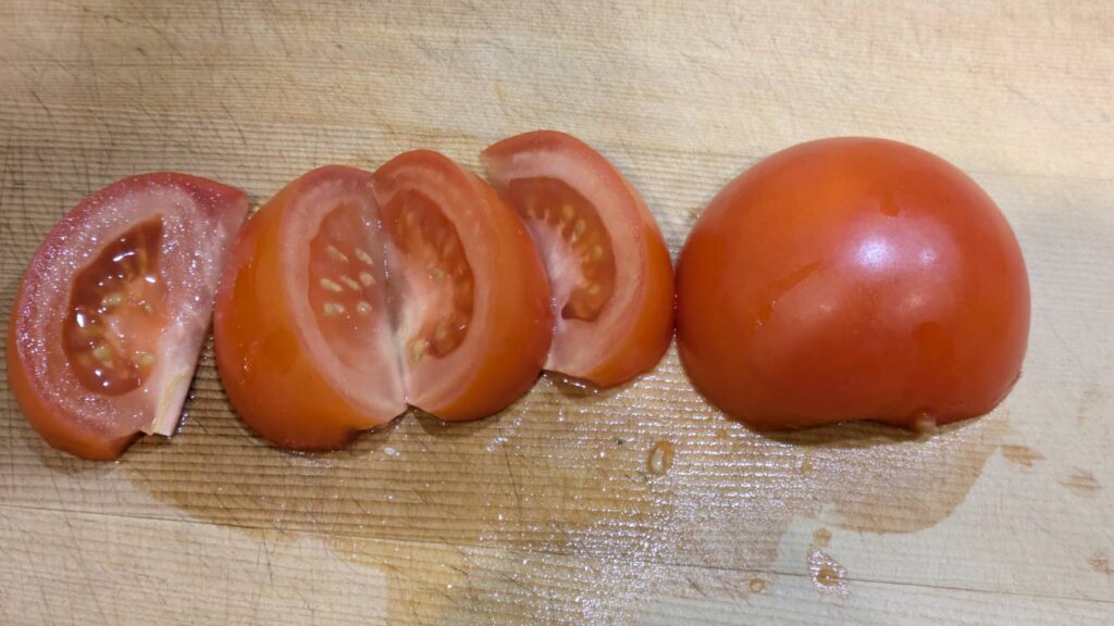 写真はトマトを半分に切り、4等分に切りました。