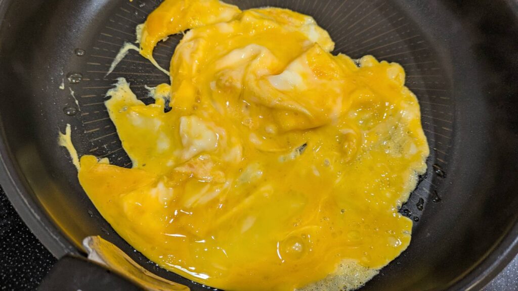 卵を炒める時は、少し半熟くらいで止めてあげるとあとでトマトと合わせる時に丁度良くふわふわに仕上がります。