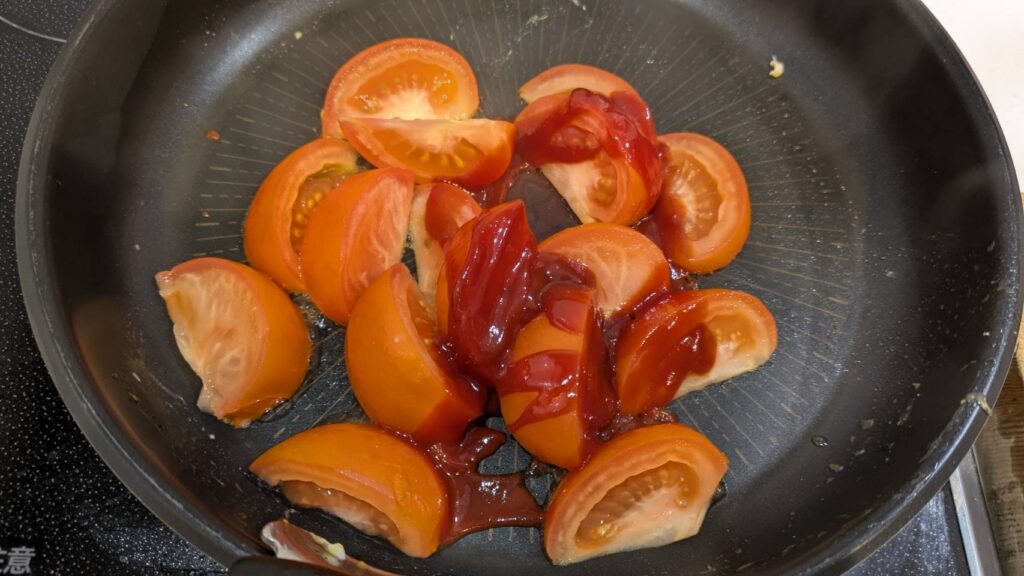 4.フライパンを再度中火にかけ温まったら、トマト、ケチャップ、オイスターソースを入れ炒める。